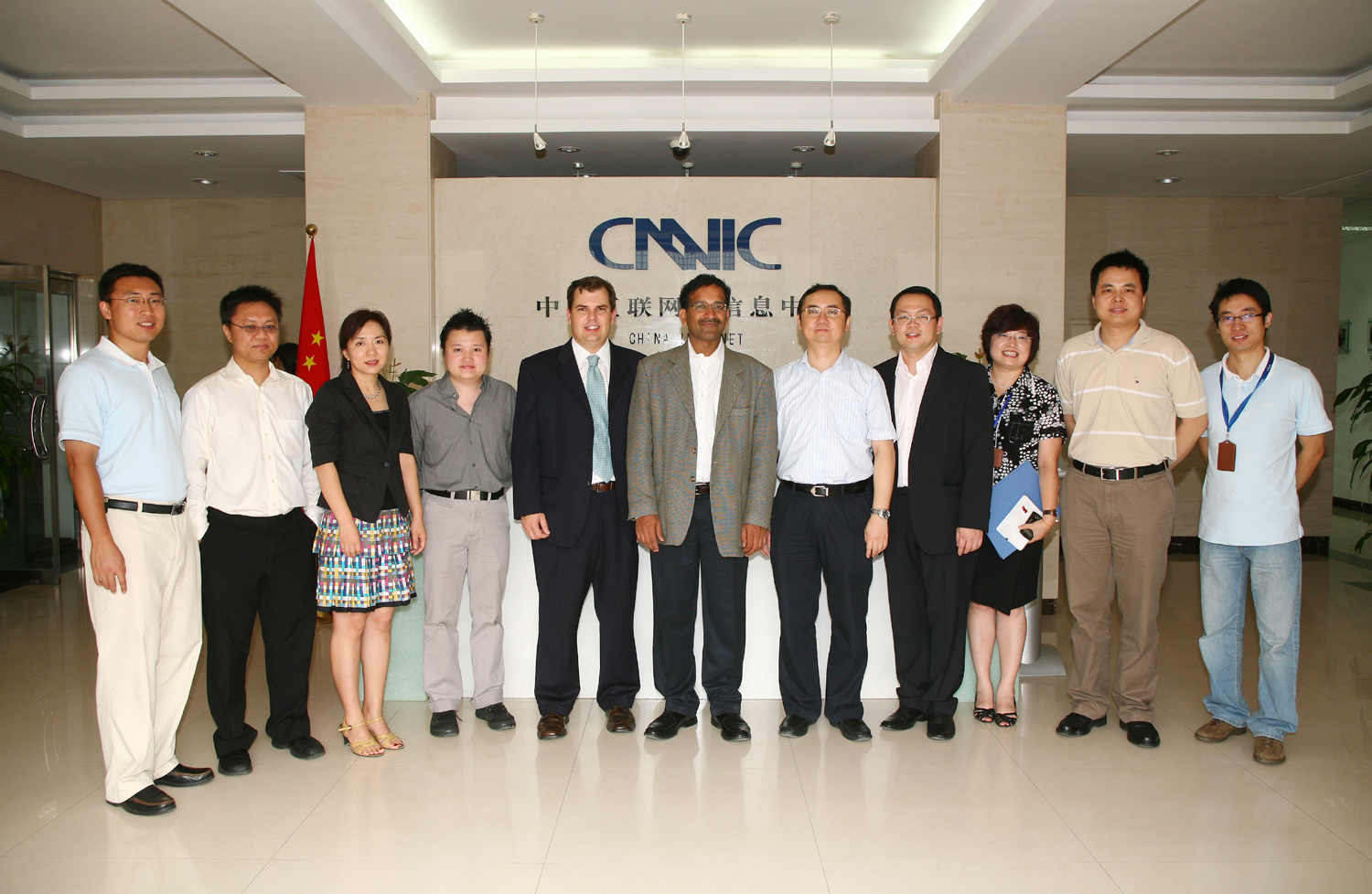 Afilias执行副总裁兼CTORam Mohan(左六)和PIR法律与政策理事Adam p. Palmer(左五)在CDNC部分理事及会员陪同下于2009年8月3日参观了CNNIC. CNNIC主任毛伟(右五) 和副主任李晓东(右二)等接待了来宾,并就有关大家共同感兴趣的议题进行了交流.